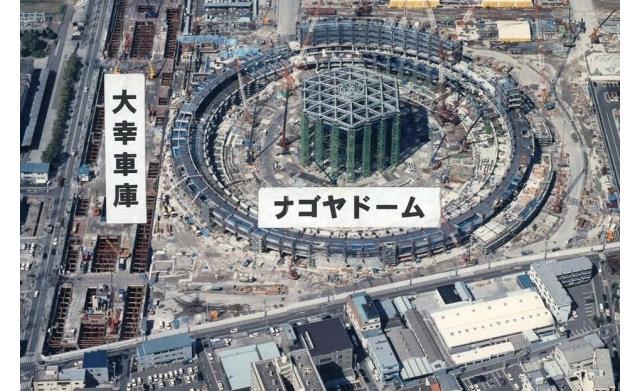 ナゴヤドーム付近の大幸車庫建設工事を空から見た様子